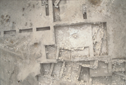 Drachenphoto der Grabungsstelle Zitadelle Plateau-Ost mit Freifläche und einer Raumreihe auf der unterhalb liegenden Terrassenstufe (Norden ist rechts)